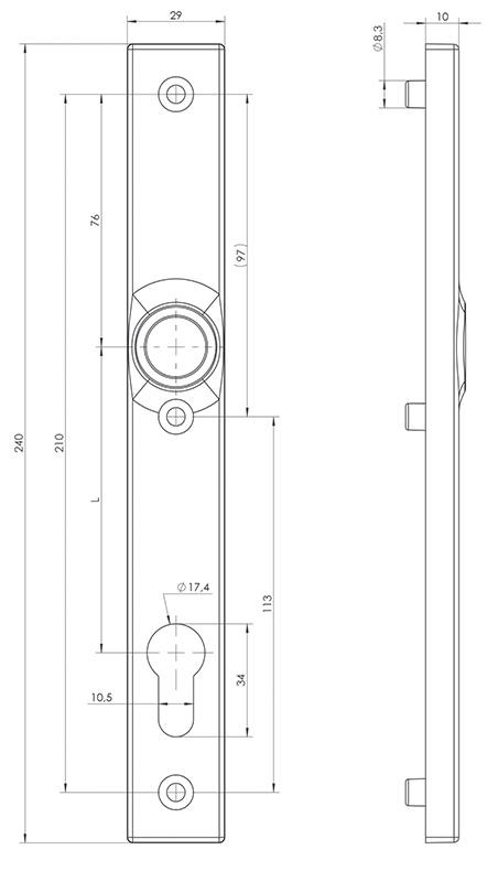 Mânerul H2 combinat cu plăcuța S2 dispune de trei puncte de prindere, amplasate la distanțe de 97 mm între șurubul superior și cel de mijloc, respectiv 113 mm între cel de mijloc și cel inferior, ceea ce asigură rezistența și durabilitatea produsului. Dimensiunea totală este de 240 mm, mânerul putând fi rotit la 360°, păstrând aceeași forță de revenire în orice poziție.